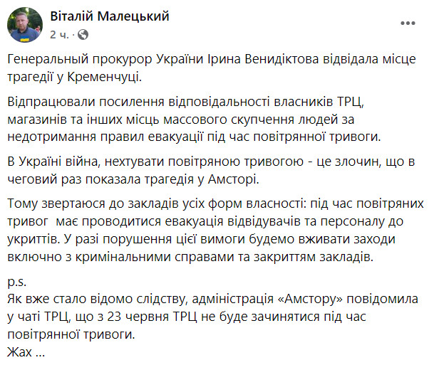 По словам Малецкого, место трагедии в Кременчуге посетила генеральный прокурор Ирина Венедиктова.