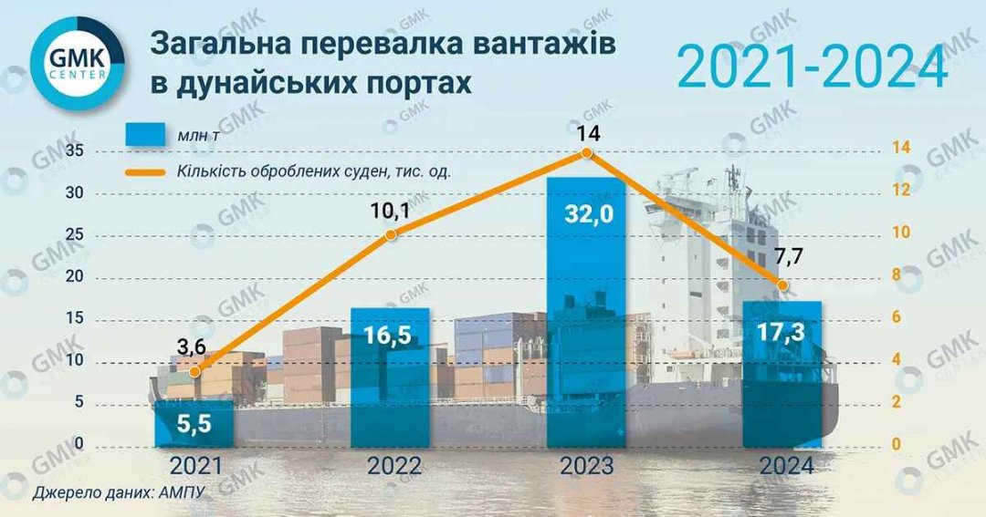 В 2024 году дунайские порты Украины столкнулись со значительным снижением объемов перевалки грузов. По данным аналитического центра ГМК Центр, общий объем грузооборота уменьшился на 45,9%, составив 17,3 млн тонн. Это сокращение обусловлено активным функционированием морского коридора, который перетянул значительную часть грузопотока в одесские глубоководные порты.