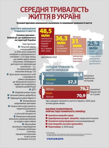 Численность населения страны также неуклонно снижается. По данным статистики, если в декабре 2001 года в Украине проживало 48,5 млн человек, то к августу 2023 года эта цифра уменьшилась до 36,3 млн, а на начало 2025 года составила около 31 млн человек. Аналитики прогнозируют дальнейшее сокращение численности населения в ближайшее десятилетие, вплоть до 25,2 млн человек.