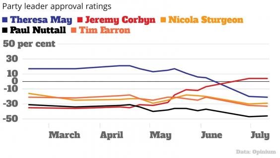 Исследование показало, что рейтинг Мэй продолжает снижаться на фоне роста популярности лидера лейбористов Джереми Корбина. Так, работу Мэй одобряют 30% британцев, а не одобряют - 51%, в то время как те же показатели в Корбина составляют 41% и 37% соответственно.