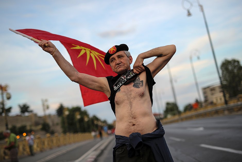 Сторонник правой оппозиционной партии ВМРО-ДПМНЕ (Внутренняя македонская революционная организация — Демократическая партия за македонское национальное единство) размахивает македонским флагом на акции протеста против переименования Македонии