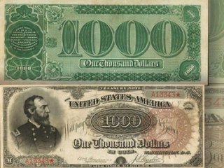 Купюру, выпущенную в 1890 году, прозвали «Гранд Арбуз» (Grand Watermelon) за огромные полосатые зеленые нули на обороте. На лицевой стороне изображен генерал-майор Джордж Гордон Мид, победивший генерала Ли в сражении при Геттисберге в 1863 году — решающей битве Гражданской войны в США.![]()