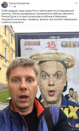 "KNAB задержал мэра города Риги и сейчас везет его в следственный изолятор. Обыски одновременно производятся в рабочем кабинете в Рижской Думе и по месту жительства в особняке в Межапарке. Изымаются компьютеры, телефоны, флешки, все носители информации и рабочии документы", - написал Панкратов.