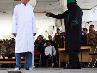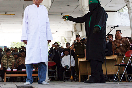 Инцидент произошел в консервативной провинции Ачех. На снимках видно, как двух мужчин примерно 50-летнего возраста в белой одежде наказывают ударами бамбуковыми палками. Имена провинившихся не раскрываются.
