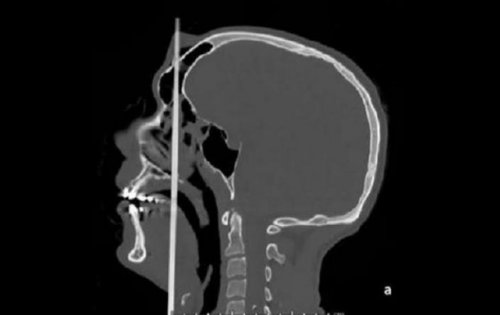 Стрела вошла в голову человека в районе подбородка, в том месте, где начинается язык. Она прошла насквозь через весть череп и вышла посреди лба.