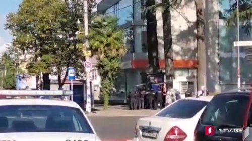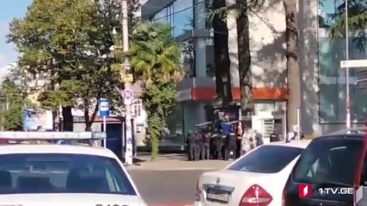 Захватчик банка в грузинском городе Зугдиди вышел из здания в окружении частично обездвиженных заложников. В руке он держал нечто, похожее на гранату.