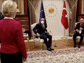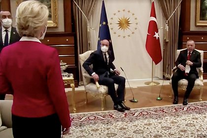 Накануне стало известно, что главу Еврокомиссии оставили без стула на переговорах с турецким президентом. В то время как глава Евросовета Шарль Мишель получил кресло рядом с турецким лидером, фон дер Ляйен пришлось сесть на диван.