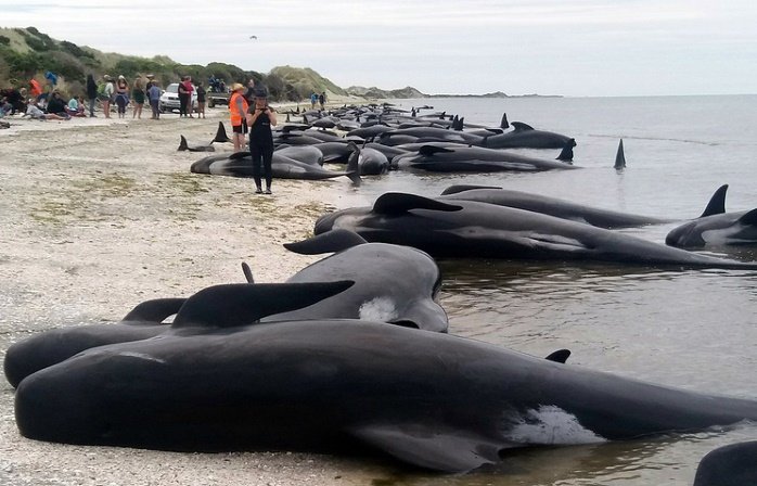 Минувшей ночью свыше 400 дельфинов-гринд выбросились на берег мыса Фаруэлл, расположенного на севере новозеландского острова Южный, 300 из них погибли.