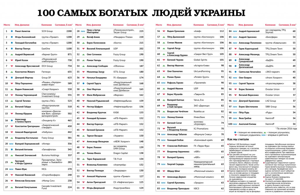 А первые строчки в рейтинге по традиции заняли Ринат Ахметов с состоянием в 2 200 миллионов долларов, а также владельцы холдинга «Приват» Игорь Коломойский и Геннадий Боголюбов (по 1 200 миллионов каждый).