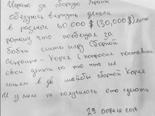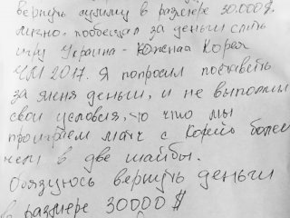 "Пообещал за деньги слить игру Украина – Южная Корея ЧМ 2017. Я попросил поставить за меня деньги и не выполнил свои условия, что мы проиграем матч с Южной Кореей более чем в две шайбы", – написано в расписке, подписанной Вариводой.