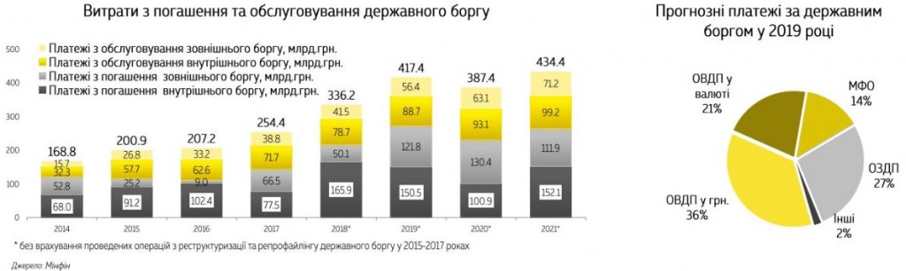 В 2019 году необходимо погасить 150,5 млрд грн внутреннего и 121,8 млрд грн внешнего долга. Платежи по обслуживанию внутреннего долга составят 88,7 млрд грн, внешнего - 56,4 млрд грн.