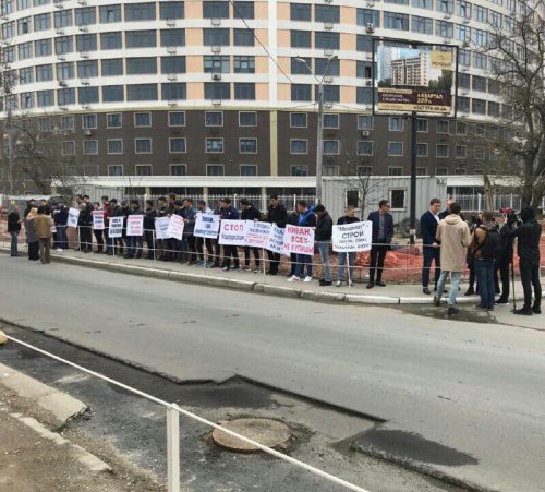 В Одессе на улице Каманина возле нового жилого комплекса собралась группа парней, требующих снести уже заселенный дом.