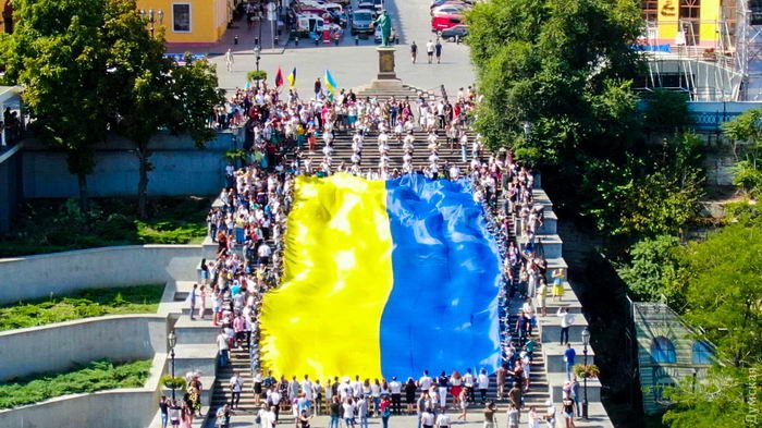 Одесситы 23 августа развернули на Потемкинской лестнице огромный национальный флаг, символизирующий 28-ю годовщину Независимости Украины.