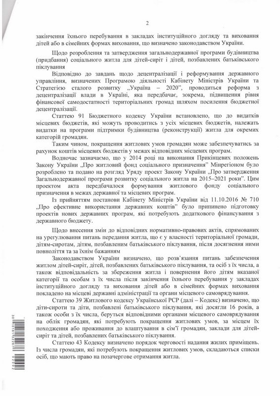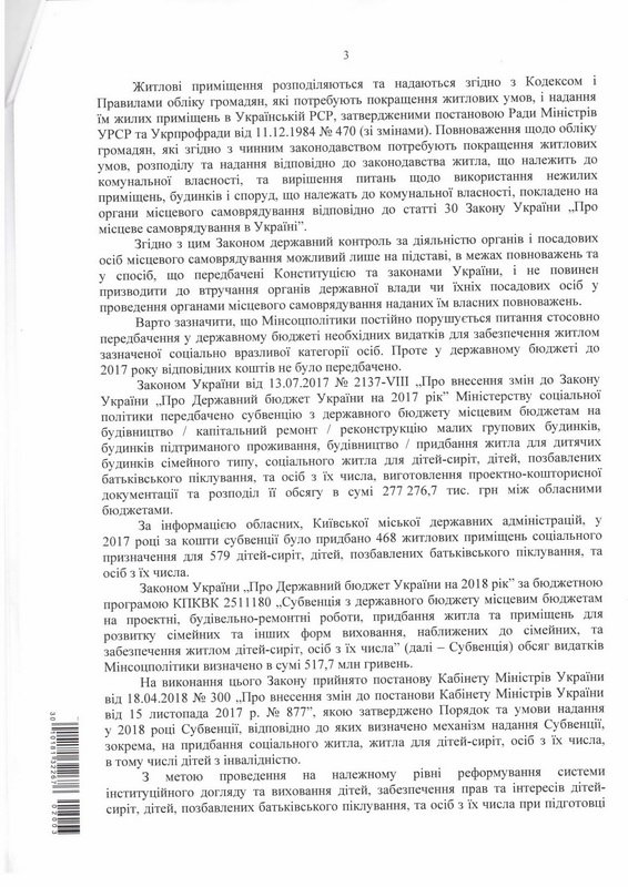 Также разъясняется, что статьей 91 Бюджетного кодекса Украины установлено, что к расходам местных бюджетов, которые могут проводиться из всех местных бюджетов, относятся расходы на программы поддержки строительства (реконструкции) жилья для отдельных категорий граждан. Таким образом, улучшение жилищных условий граждан может обеспечиваться за счет средств местных бюджетов в пределах соответствующих местных программ. Законодательством Украины определено, что решение вопросов обеспечения жильем детей-сирот, детей, лишенных родительской опеки, и лиц из их числа, а также ответственность за сохранность жилья и возвращение его детям указанной категории и лицам из их числа по окончании их пребывания в учреждениях институционального ухода и воспитания детей или в семейных формах воспитания возложена на местные государственные администрации и органы местного самоуправления.