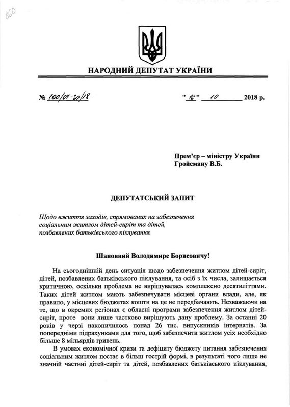 Поэтому, подчеркивает народный депутат, необходимо ужесточить контроль за выполнением законодательно установленного права на жилье детей-сирот и детей, лишенных родительской опеки, в том числе за формированием жилищного фонда социального назначения.