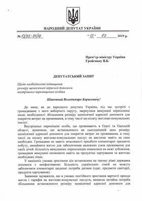 Первым шагом стал депутатский запрос на имя Премьер-министра страны Владимира Гройсмана, благодаря чему удалось добиться упрощения получения социальных выплат для переселенцев. Во властные структуры был направлен также депутатский запрос о финансировании государственных жилищных программ для молодых семей и переселенцев. В нем шла речь о необходимости внесения изменений в порядок назначения жилищных субсидий незащищенным категориям граждан.