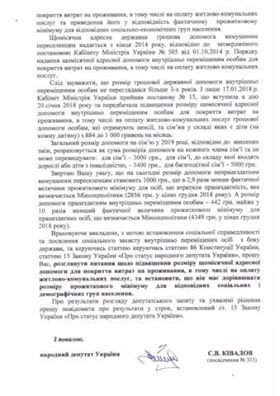 Еще одна позиция, очень важная для переселенцев – увеличение ежемесячных государственных выплат. Народный депутат занялся и этой насущной проблемой. В запросе на имя Премьер-министра Владимира Гройсмана Сергей Кивалов пишет: