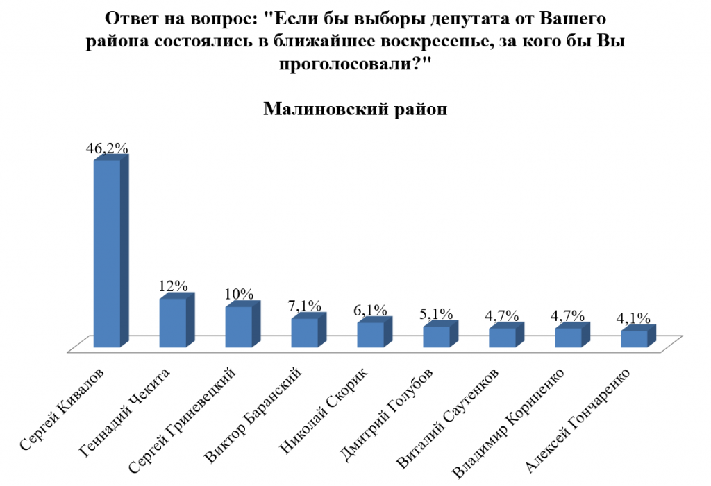 Исследования показали, что в Малиновском районе уровень узнаваемости Сергея Кивалова достигает 46,2%, Геннадия Чекиты – 12%, Сергея Гринивецкого – 10%, Виктора Баранского – 7.1%, Николая Скорика – 6,1%, Дмитрия Голубова – 5,1%, Виталия Саутенкова – 4,7%, Владимира Корниенко – 4,7%, Алексей Гончаренко – 4,1%.