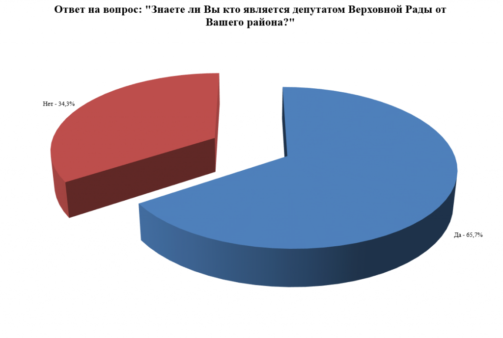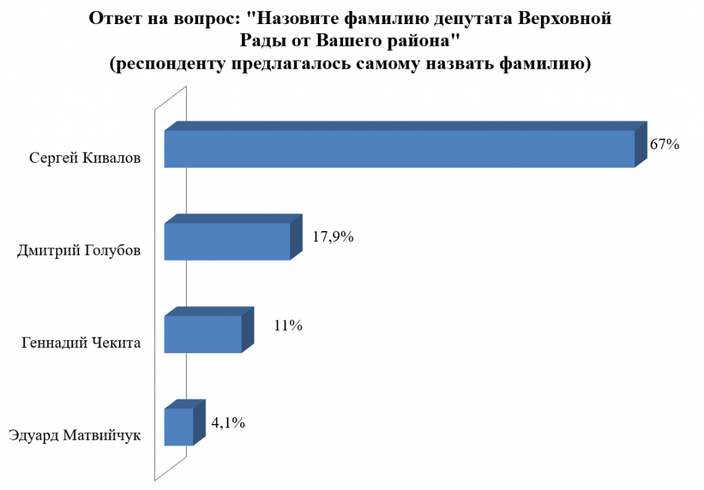 Также из опроса следует, что знают депутата Верховной Рады от своего района 65,7%, не знают 34,3%. На вопрос о фамилии депутата – самый высокий уровень узнаваемости у Сергея Кивалова – 67%, за ним следуют Дмитрий Голубов – 17,9%, Геннадий Чекита – 11%, Эдуард Матвийчук – 4,1%.