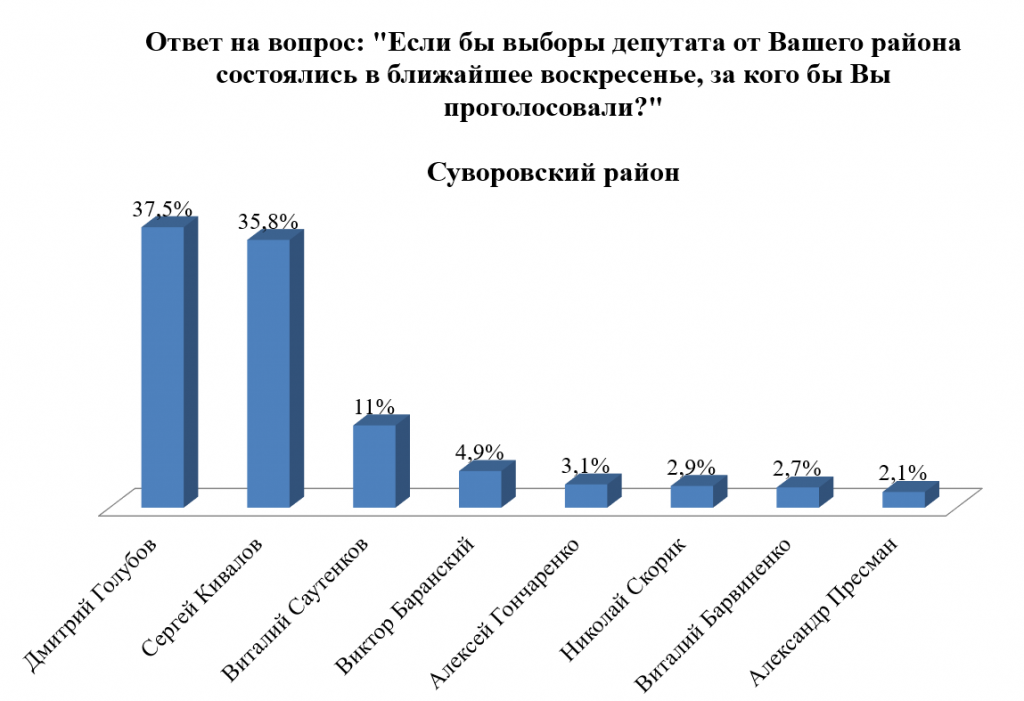 Высокие показатели в Суворовском районе демонстрирует также Дмитрий Голубов – 37,5%, в то время как у Сергея Кивалова сильные позиции с результатом в 35,8%. Далее идут Виталий Саутенков – 11%, Виктор Баранский – 4,9%, Алексей Гончаренко – 3,1%, Николай Скорик – 2,9%, Виталий Барвиненко – 2,7%, Александр Пресман – 2,1%.