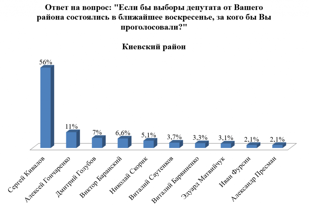 Результаты по Киевскому району: Сергей Кивалов – 56%, Алексей Гончаренко – 11%, Дмитрий Голубов – 7%, Виктор Баранский – 6,6%, Николай Скорик – 5,1%, Виталий Саутенков – 3,7%, Виталий Барвиненко – 3,3%, Эдуард Матвийчук – 3,1%, Иван Фурсин – 2,1%, Александр Пресман – 2,1%.