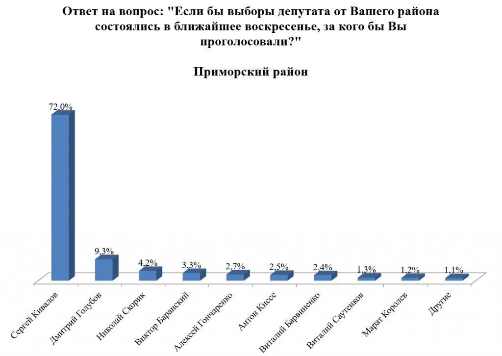 На вопрос: Если бы выборы депутата от Вашего района состоялись в ближайшее воскресенье, за кого бы Вы проголосовали, одесситы ответили следующим образом. В Приморском районе уверенно лидирует Сергей Кивалов с результатом 72%. При этом отрыв в рейтинге колоссальный! Так, свой голос за Дмитрия Голубова отдали бы 9,3% респондентов; Николая Скорика – 4,2; Виктора Баранского – 3,3%; Алексея Гончаренко – 2,7%; Антона Киссе – 2,5%; Виталия Барвиненко – 2,4%; Виталия Саутенкова – 1,3%. Один из самых низких уровней узнаваемости у Марата Королева – действующий глава райадминистрации набирает всего 1,2%.