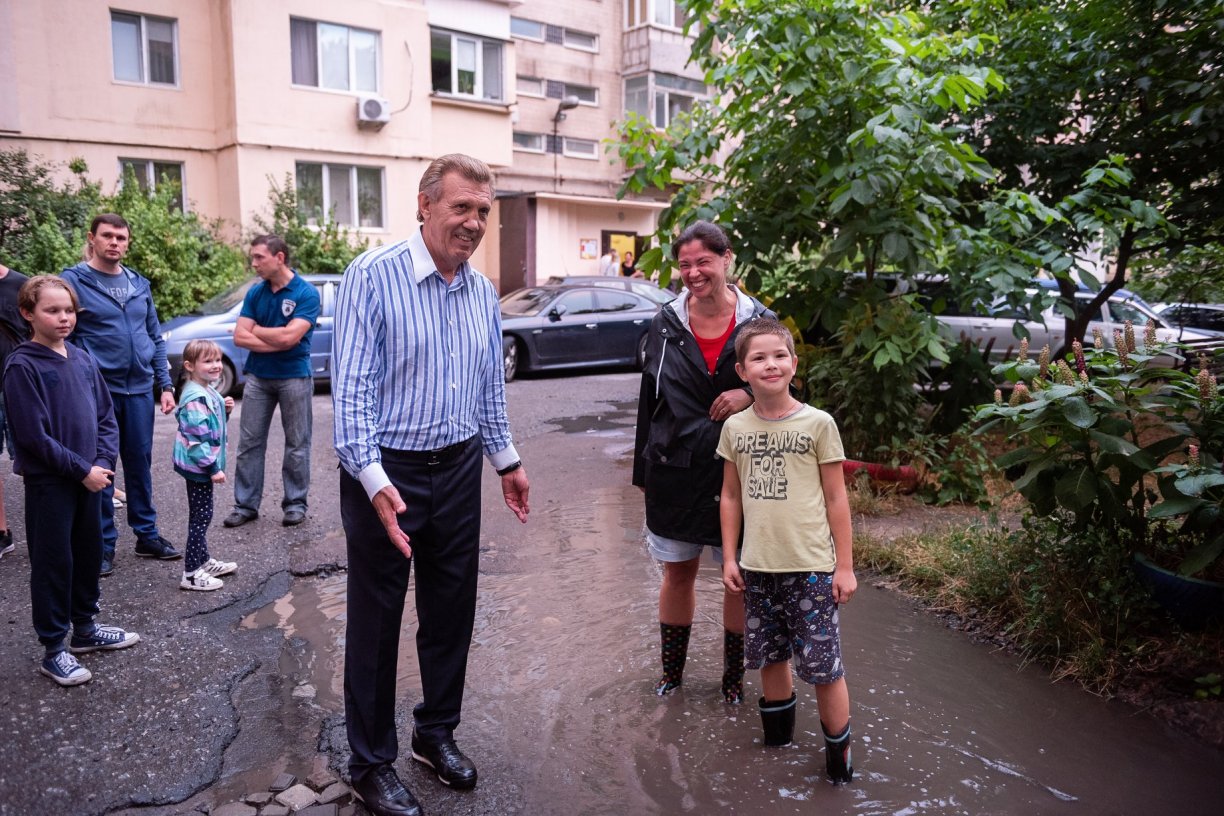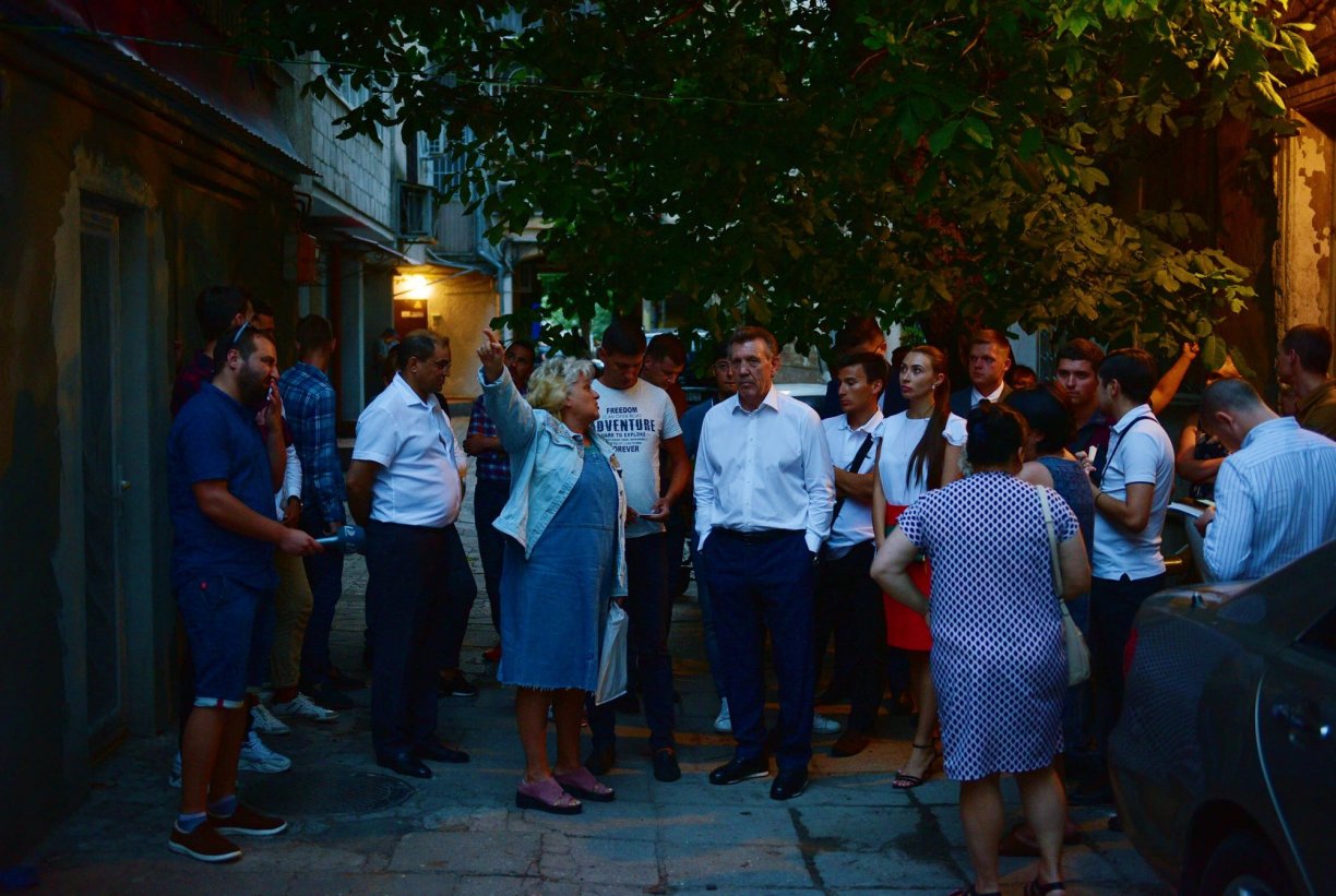 А многие одесситы, в частности, живущие в доме на проспекте Шевченко, 6 еще неделю назад могли добавить “главное вовремя укрывать от падающих сухих веток”. Сергей Васильевич Кивалов встретился с одесситами, живущими в этом доме, узнал об аварийном состоянии деревьев во дворе и немедленно поручил привести двор в порядок. Поэтому кроме деревьев занялись и асфальтом, который напоминал решето, и канализацией, которая лила пять дней подряд: в доме воды почти неделю нет, зато во дворе лужи. И платить за это тоже одесситам. Неделю спустя Сергей Васильевич пришел проверить как провели работы во дворе, а его встречают благодарные одесситы, которые еще и стол накрыли во дворе по случаю прихода гостя.