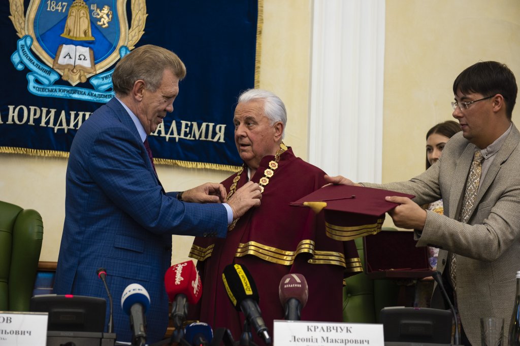 Следуя традиции ведущих университетов Европы и США присуждать звание Honoris Causa выдающимся политическим, общественным деятелям, людям, достигшим больших высот в различных сферах жизни, и учитывая неоценимый вклад Леонида Макаровича в развитие нашего государства и общества, дипломатическую и миротворческую деятельность, решением Ученого Совета было принято решение присудить первому Президенту наивысшее звание почётного доктора Honoris Causa Национального университета «Одесская юридическая академия».