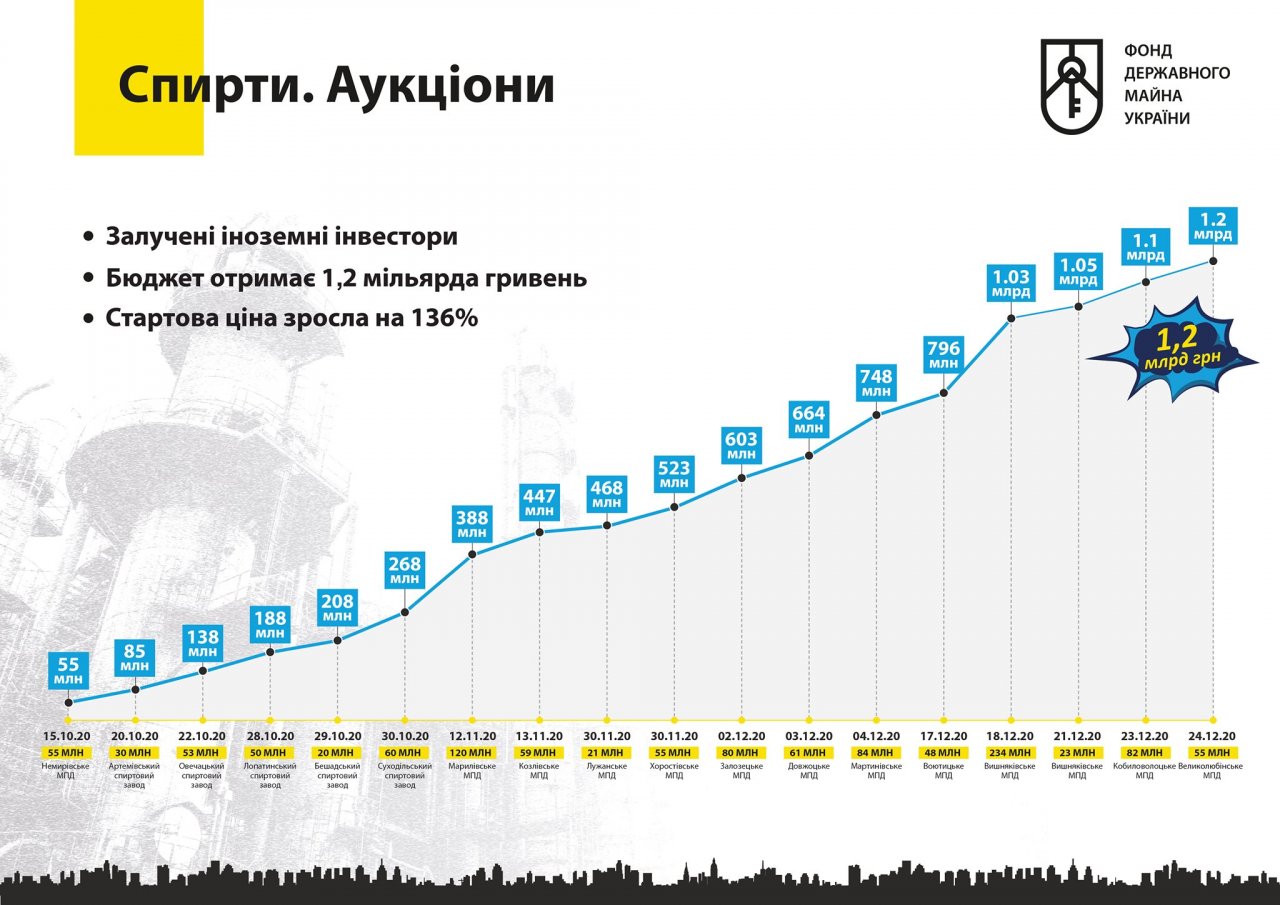 По словам главы ФГИ Дмитрия Сенниченко, приватизации спиртзаводов продолжиться в 2021 году, от которой фонд ожидает привлечения еще 1 млрд грн.