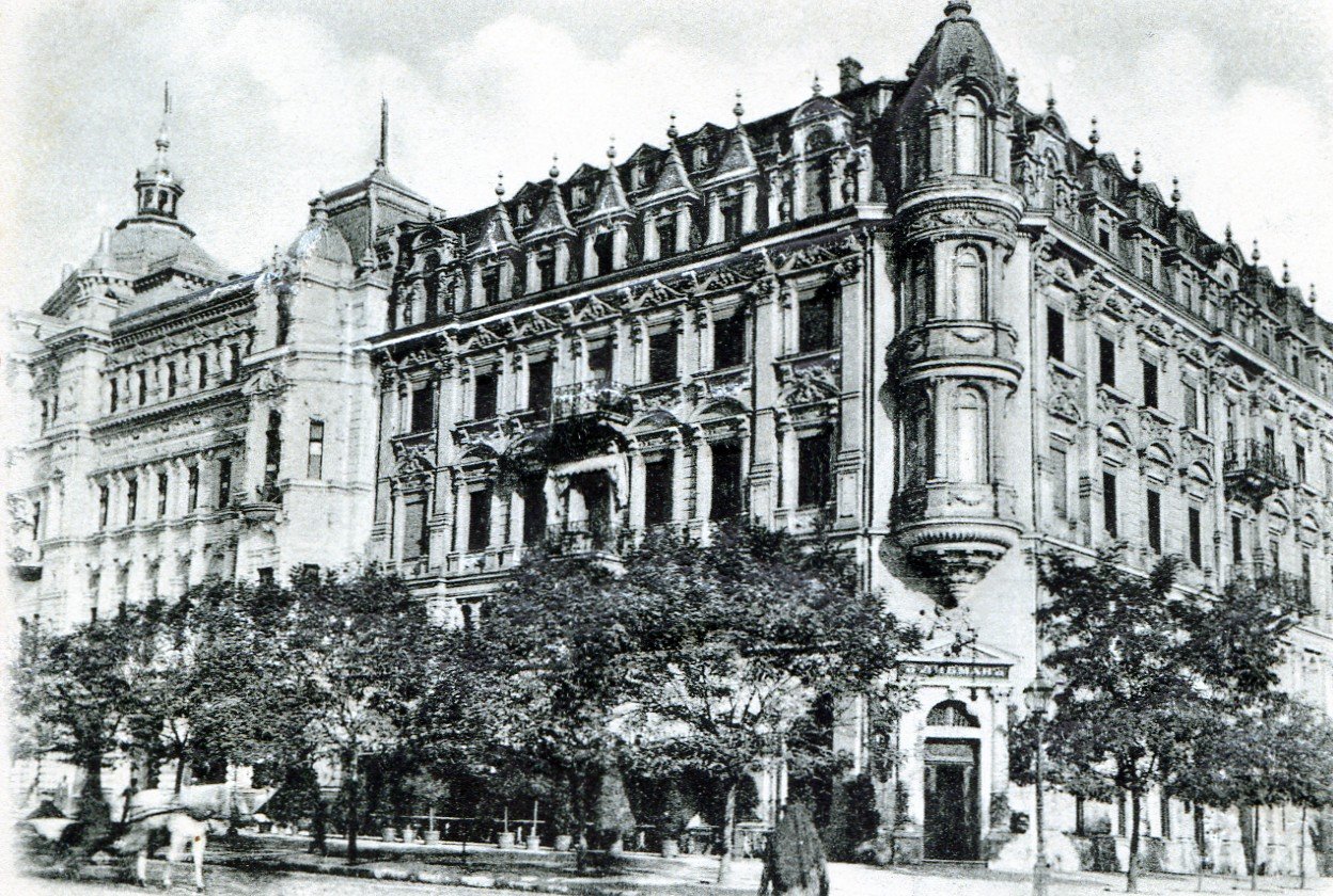 На первом этаже, где позже долго размещалась сберкасса (после магазин "Ксерокс"), находилось кафе с застекленной верандой, выходящей на Садовую улицу, изысканно отделанным залом и бильярдными комнатами. Здесь бывал А. И. Куприн, собирались в конце 1910-х годов начинающие художники, литераторы - Эдуард Багрицкий, Лев Славин...
